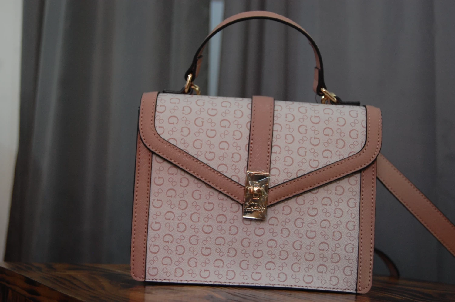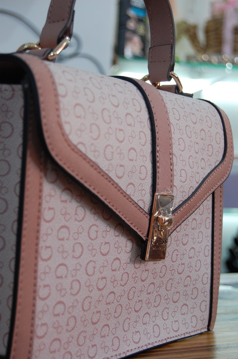 A bolsa é um modelo da marca GUESS, com design elegante em rosa e bege, fecho dourado e padrão com a letra "G".
